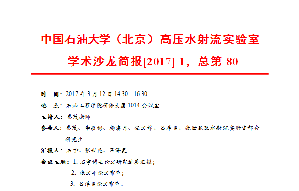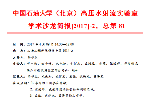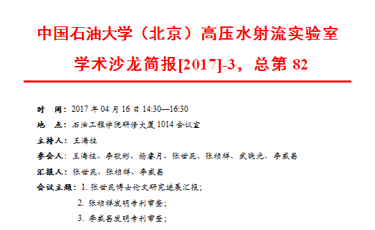 文化建设 收起 学术沙龙 文体活动 短文分享 友情链接 下载专区 OA平台 学术沙龙简报[2017]-3,总第822017-06-14 本次学术沙龙包括三个方面: 1. 张世昆博士论文研究进展汇报; 2. 张祯祥发明专利审查; 3. 李威昌发明专利审查; [查看详情 ] 学术沙龙简报[2017]-2,总第812017-06-14 本次学术沙龙包括三个方面: 1. 李老师出国参会总结; 2. 宋老师,史老师连续油管钻井调研汇报; 3. 王猛,武晓光,吕泽昊论文审查。 [查看详情 ] 学术沙龙简报[2017]-1,总第802017-06-04 本次学术沙龙包括三个方面: 1. 石宇博士论文研究进展汇报; 2. 张文平论文审查; 3. 吕泽昊论文审查。 [查看详情 ] 共93条记录 19/19页 首页 上一页 下一页 尾页 第 1 2 3 4 5 6 7 8 9 10 11 12 13 14 15 16 17 18 19 页